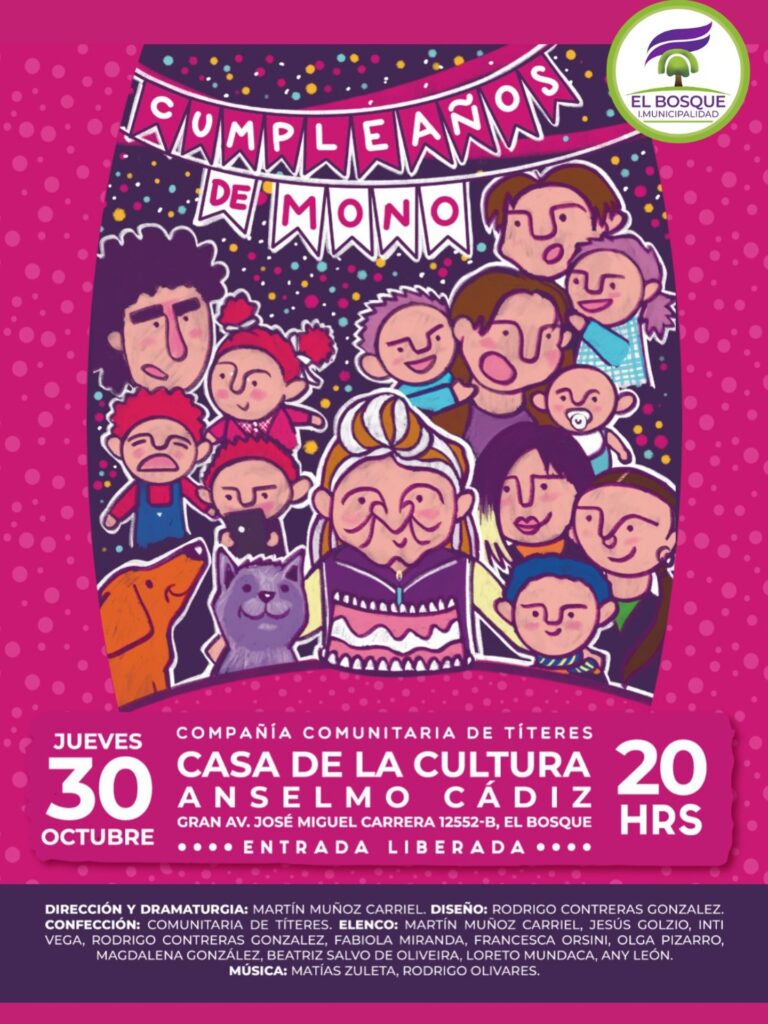 Este jueves 30 de octubre, a las 20:00 horas, la Compañía Comunitaria de Títeres presenta su entrañable obra “Cumpleaños de Mono”, bajo la dirección de Martín Muñoz.