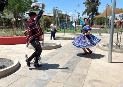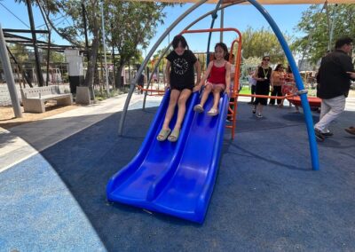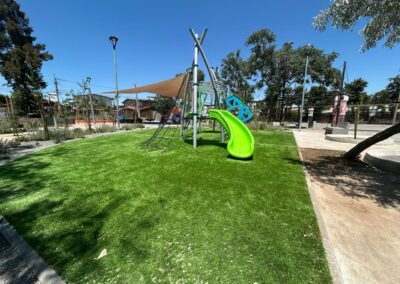 Para potenciar el uso comunitario, se incorporaron dos nuevos juegos infantiles y nueve luminarias LED ornamentales sobre postes de 5 metros de altura, permitiendo el uso seguro del espacio en horario nocturno. Estos elementos, junto con el paisajismo renovado, mejoran significativamente la imagen urbana, el microclima y la identidad del lugar como área verde de calidad.